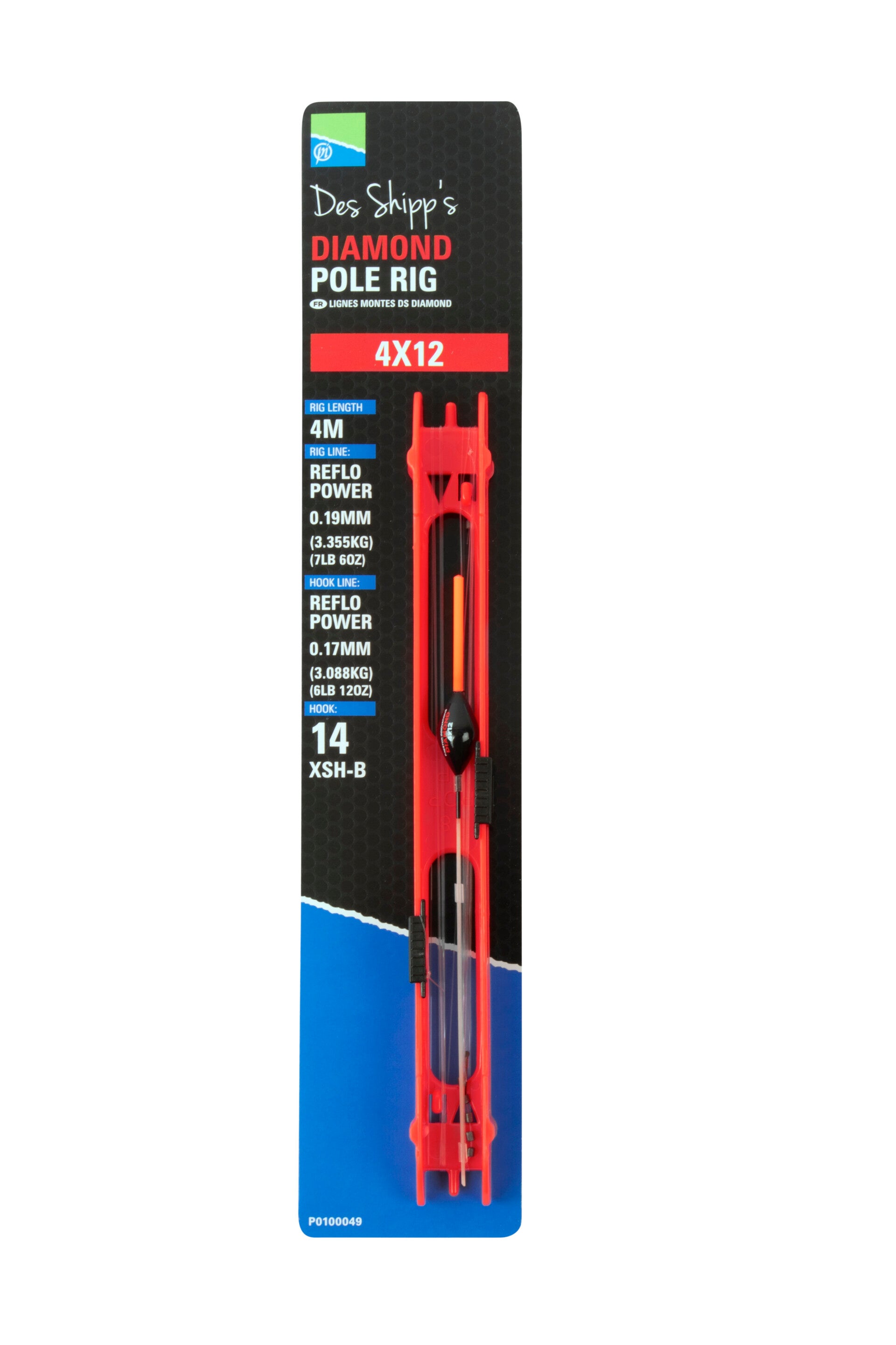 Gemaakt van de allerbeste componenten en gebaseerd op onderlijnen die zijn gemaakt door onze eigen adviseurs, zijn de diamond dobber rigs perfect voor gebruik op alle commerciële visserijen. De dobbers zijn voorzien van het nieuwe Dura-zijoog waardoor ze veel sterker zijn dan elke dobber met een standaard zijoog, zonder de balans te veranderen. Reflo Power wordt gebruikt voor alle hoofdlijnen en onderlijnen, terwijl onze populaire XSH-B-haken de perfecte allround haak zijn die voor een breed scala aan aassoorten kan worden gebruikt. Stotz worden op alle rigs gebruikt in een shotting-patroon dat past bij de beoogde manier van vissen. De Diamond pole Float heeft een 2 mm holle borstelharen en een steel van glasvezel, perfect voor het vissen met groot aas op de korte hengellijn. Het schotpatroon van de bulk en de droppers is positief, terwijl het aas langzaam zinkt naarmate het de bodem nadert.