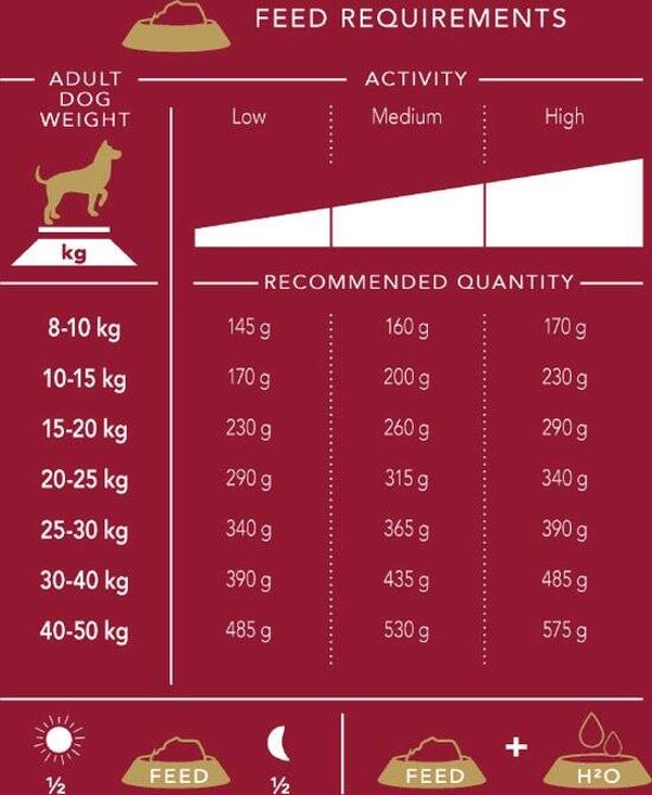 Op de achterzijde van de zak zie je een voedingstabel met links in de tabel het gewicht van je hond. In de eerste rij bovenaan zie je de activiteitsgraad van je hond. Kijk bij het gewicht van je hond en zijn activiteitsgraad, hoeveel gram je hond per dag mag eten. Die hoeveelheid verdeel je dan over 2 maaltijden. Voorbeeld: weegt je hond 23kg en is die helemaal niet actief? Dan mag die 290gr per dag eten wat zich omzet in 2 maaltijden van telkens 145gr.