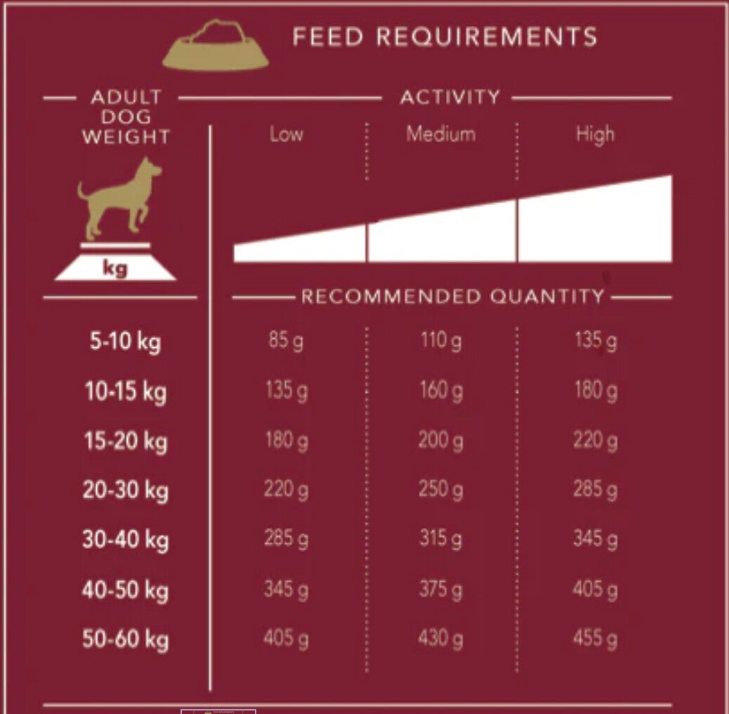 Op de achterzijde van de zak zie je een voedingstabel met links in de tabel het gewicht van je hond. In de eerste rij bovenaan zie je de activiteitsgraad van je hond. Kijk bij het gewicht van je hond en zijn activiteitsgraad, hoeveel gram je hond per dag mag eten. Die hoeveelheid verdeel je dan over 2 maaltijden. Voorbeeld: weegt je hond 25kg en is die niet echt actief? Dan mag die 220gr per dag eten wat zich omzet in 2 maaltijden van telkens 110gr.