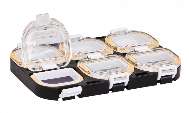 Waterdichte magneetdoos voor het opbergen en sorteren van uw haken. Compact formaat, ideaal voor in de zitmand.